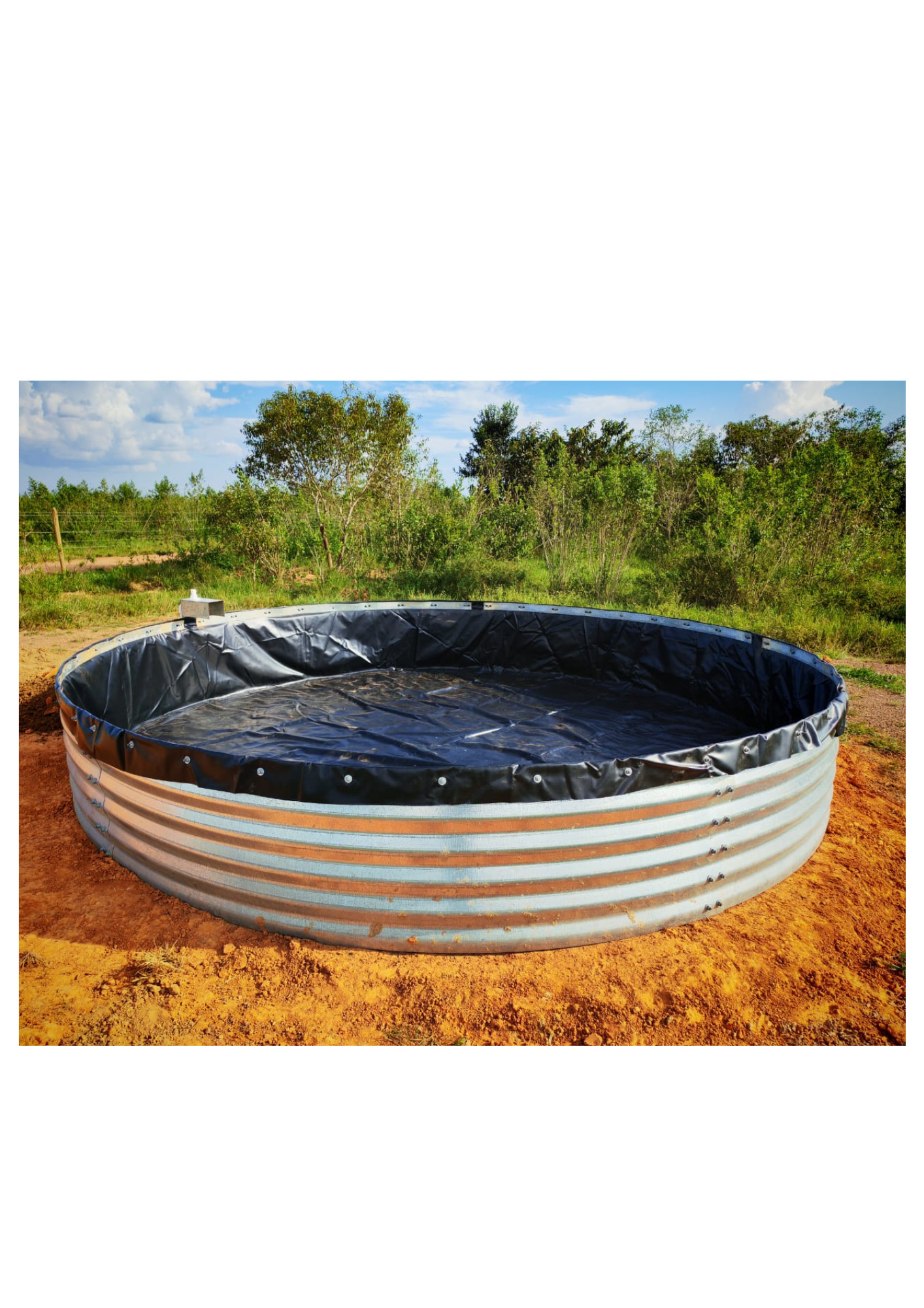 Los Durabebederos: son bebederos de alta resistencia para ganado, fabricados en lámina de acero galvanizado con capacidades desde 1.000 hasta 25.000 litros, diseñados para resistir golpes de bovinos. Uso: Almacenamiento de Agua Cruda Paneles: Galvanizados corrugados, lámina de acero galvanizado cumpliendo la norma AWWA D-103 Protector de soporte:1 und STD Ø 1” Geomembrana: PVC de 0.8 milímetros reforzados en malla de poliéster, para almacenamiento de agua cruda.